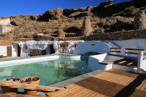 This charming cave is part of a cave complex and is situated in a small ghost town at the edge of an impressive canyon in the region of Guadix. The cave house has a bedroom with two single beds, a living room with a wood burning stove and oven, a kitchen and a bathroom. The cave complex is offering in total six cave houses. It has a spectacular communal swimming pool of which the water seems to flow into the canyon and at the other side the swimming pool is disappearing into the mountain; into a cave of 8 meters long. The nearest town, which has all the facilities, is Bácor (11 km) or the city Baza (20 km).