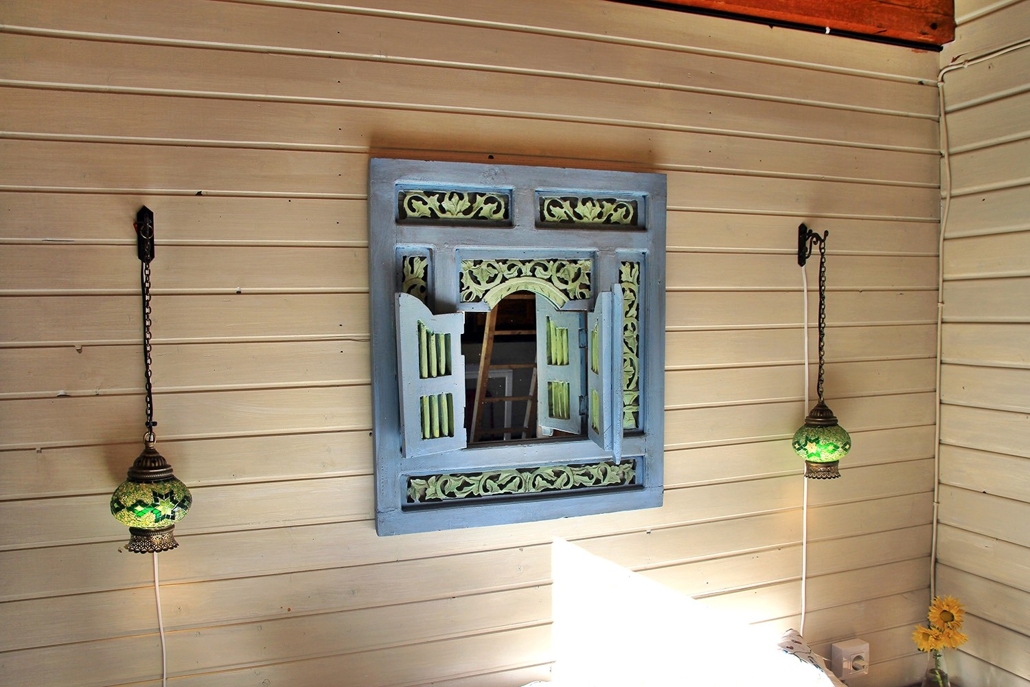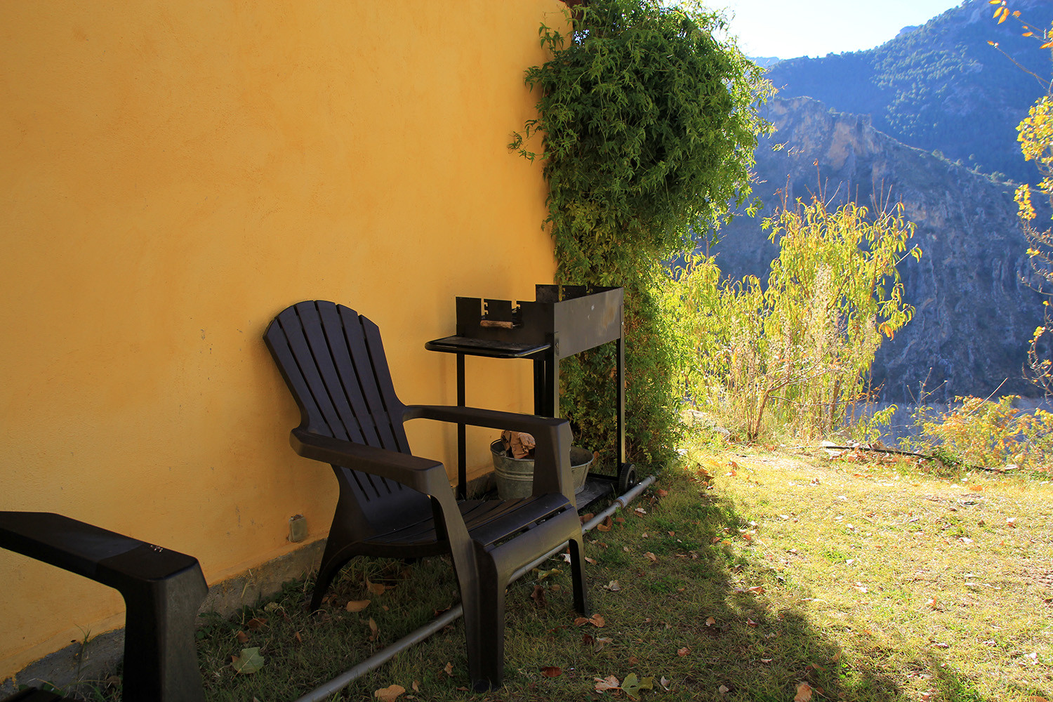The porch has a small terrace and also at the back of the cabin is a terrace with a table and four chairs situated.