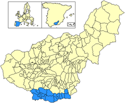 The region has 17 munipalities of which Almuñecar is the most popular beach town. It was founded by the Phoenicians one thousand years before Christ with the name of Sexi, Almuñécar is a place full of history that maintains the remains of a roman factory of a salted-fish business, five sections of an aqueduct and an Arab castle. Motril is the biggest city of the province after Granada. Among its monuments stands out the Iglesia Mayor de la Encarnación and the Santuario de Nuestra Señora de la Cabeza. In a lot of places along the coast you will encounter remains from the past; the Arabic castle of Salobreña, the old sugar factories from Motril, Arabic watchtowers near Calahonda and La Rabita. the fortresses in La Herradura, Castillo de los Baños, Castell del Ferro, La Rabita and Velez de Benaudalla.