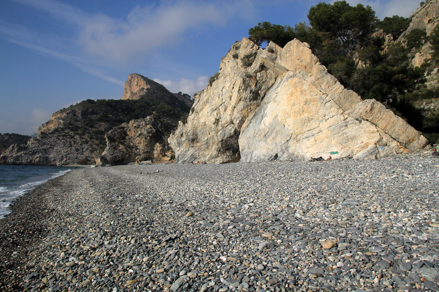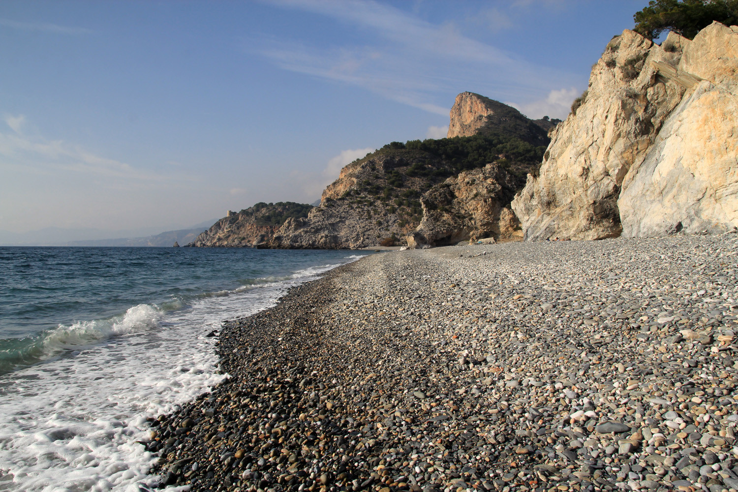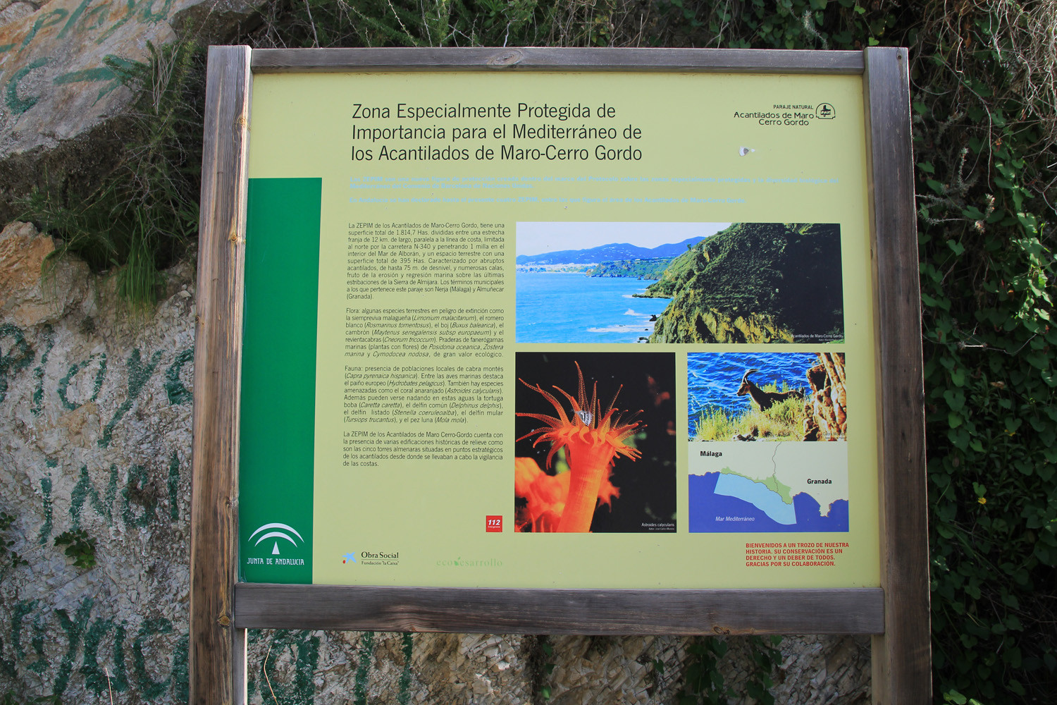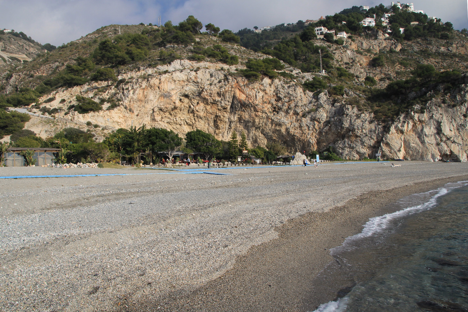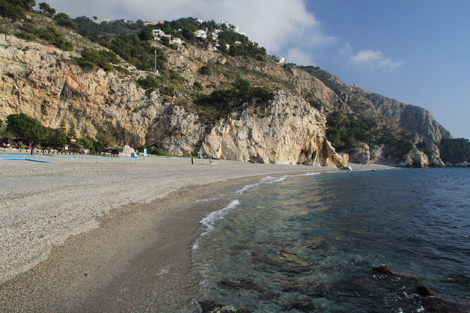 The Cliffs of Maro-Cerro Gordo are a Natural Area located between the towns of Nerja, in the province of Málaga and Almuñécar of the province of Granada,. It is declared as ZEPIM (Specially Protected Area of Importance for the Mediterranean) Importance. It consists of a series of coves and cliffs up to 250 m of altitude, formed by foothills of the Sierras de Tejeda, Almijara and Alhama, eroded by the waves of the sea. In the same geological complex, is the Cueva de Nerja situated, even if the delimitation of Natural Place. Highlights include the beaches of Las Alberquillas, Cala del Cañuelo, both in Malaga, and Cantarriján situated in Granada which is a nude beach.