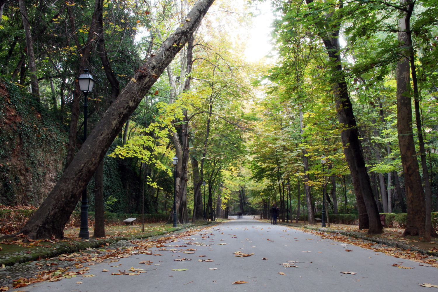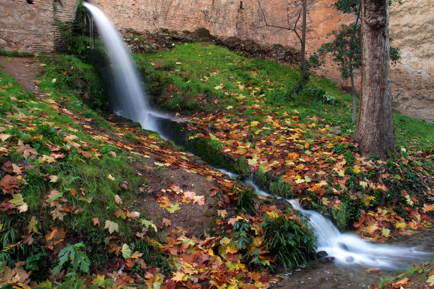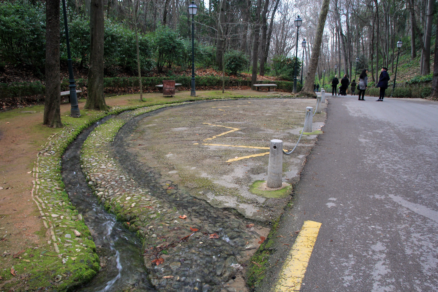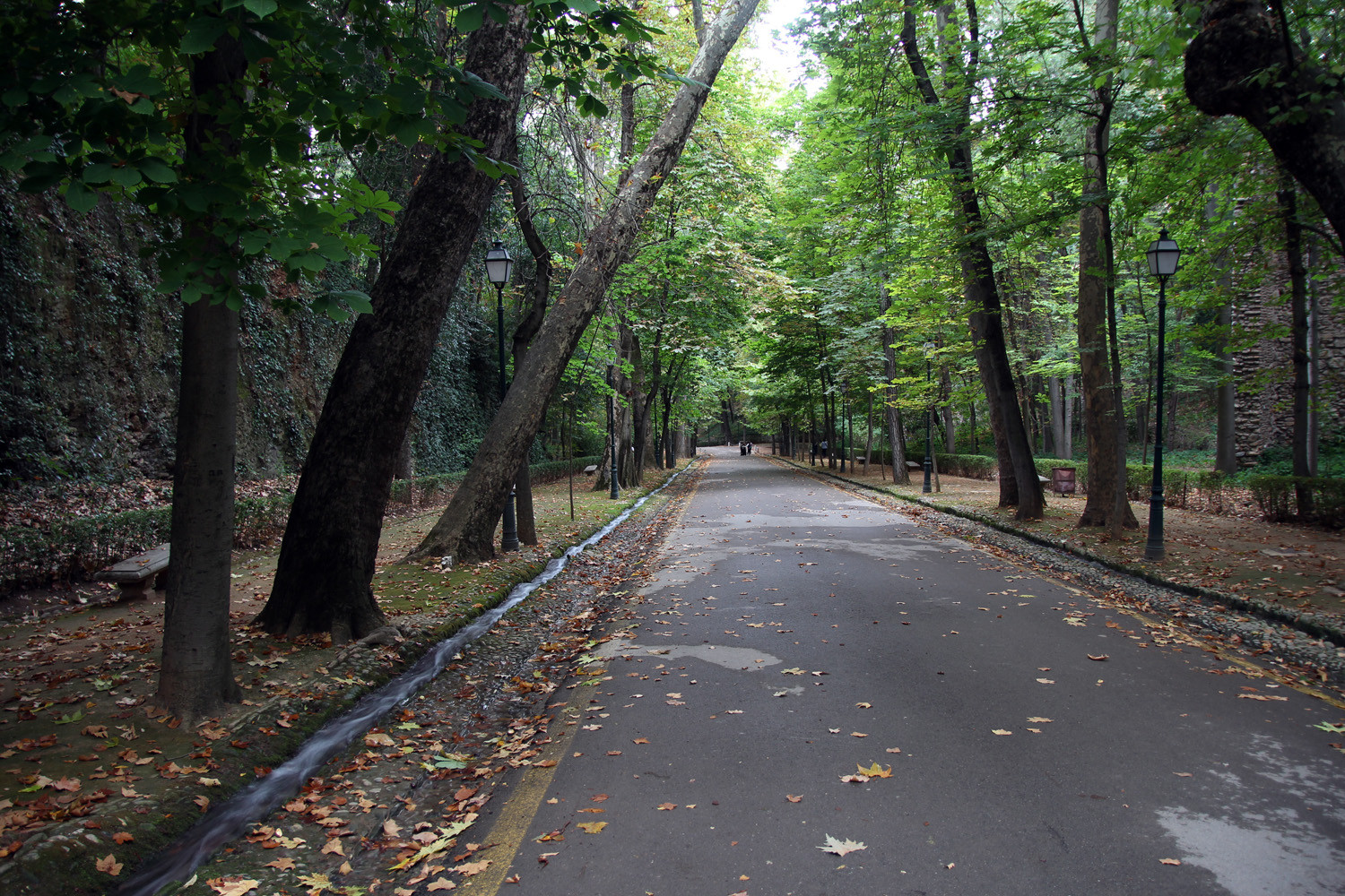 The "Bosque de Alhambra" is the forest that encircles the fortres Alhambra. Its boundaries is generally set by the fence surrounding the complex which starts at the bastion tower "Torre de los Picos" on the north bank of the river Darro, and to the wall that connects the Alhambra with the "Torre Bermejas" towers which covers northern and western area around the Moorish fortress. The high and slender trees obscuring the view to the sky and give these places pleasant shade and coolness in summer. Its colorful and fragrant woodland is combined with deciduous trees, poplars, buckeyes, elderberry, nettle trees, plane trees, acacias, hazel, Aleppo pine, and maple. A few poplars are dating from early Christian times. The park is refreshed by the abundance of water flowing, waterfalls and canals.