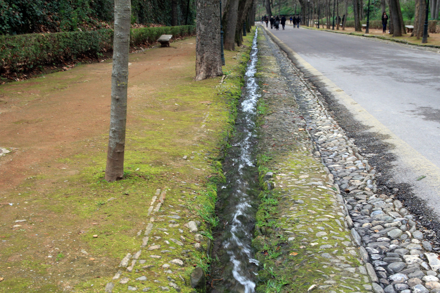 There are several ways to enter the Bosque de Alhambra. From Albaicin you can cross the river Darro (at the end of "Cuesta de Chapiz") and take a path that goes up along the Alhambra with a lot of stairs. This path is going allong a water channel what has a lot of small waterfalls. During you trip you will also see where the water is leaving the Alhambra with a lot of pressurre. It is also possible to take the "Cuesta de Gomez which is starting at "plaza Nueva" and passing the old city tower where the park starts.